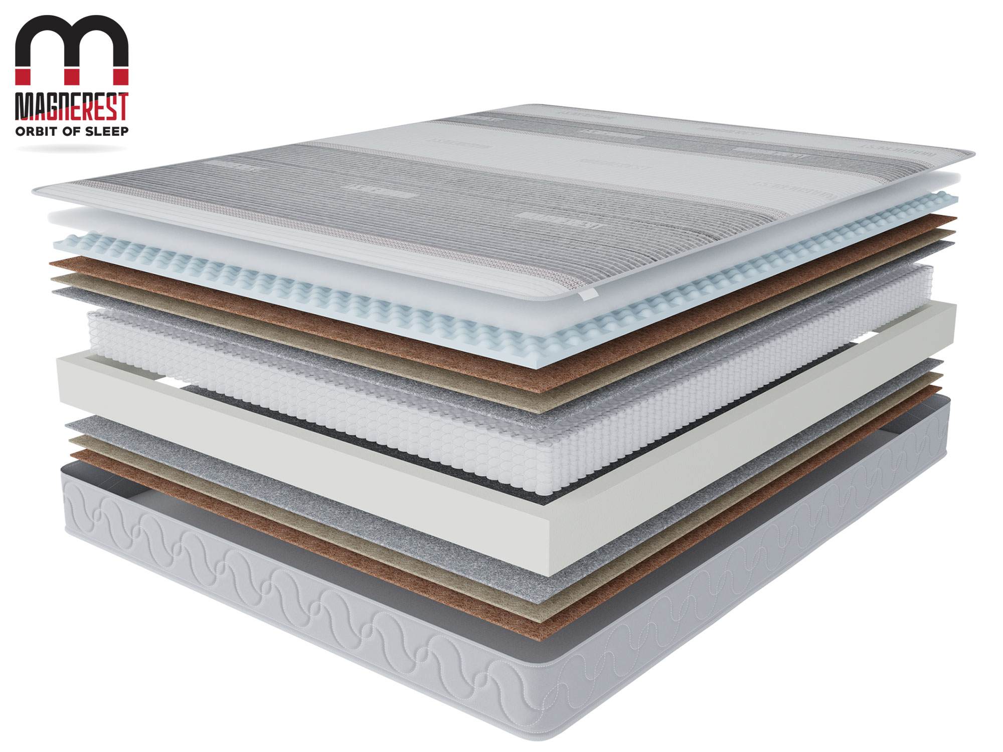 Пена упругая 2 см / Латексированный кокосовый лист 2 см / Термоволокно / БНП 500 пр, м2 / Термоволокно / Латексированный кокосовый лист 3 см/ Особо мягкая пена с ячеистой структурой 2,5 см/ Усиление периметра