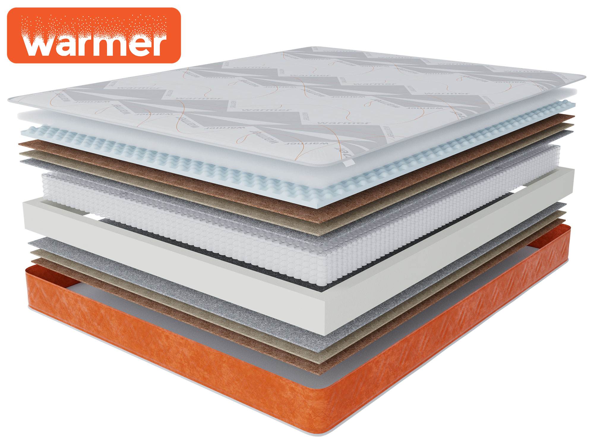 Пена упругая 2 см / Латексированный кокосовый лист 2 см / Термоволокно / БНП 500 пр.м2 / Термоволокно / Латексированный кокосовый лист 3 см / Особо мягкая пена с ячеистой структурой 2,5 см / Усиление периметра
